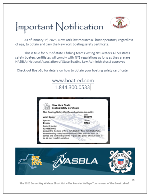 As of January 1st, 2025 New York State law requires all boaters, regardless of age, to obtain and carry the New York boating safety certificate..